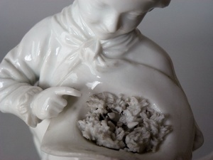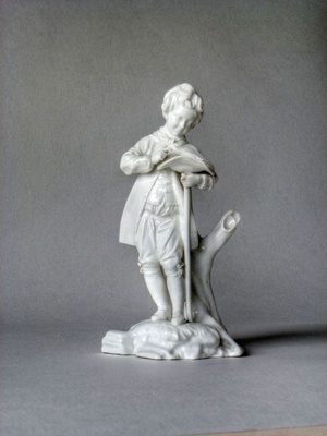 Auf einem Grassockel steht ein Knabe vor einem Baumstumpf. Mit der rechten Hand weist er auf ein Vogelnest mit jungen Vögeln, das sich in dem Hut befindet, den er auf seinem linken Unterarm hält. Der Knabe ist mit einem Hemd, Kniehosen und einem Gehrock bekleidet und trägt ein geknotetes Halstuch. Die Modellierung des Gesichts, die bewegte Körperhaltung und der weisende Finger sind Merkmale des Bildhauers und Modelleurmeisters Johann Peter Melchior (1747 - 1825). Vorbild für den Knaben ist der Kupferstich "Knabe mit Vogelnest" von Gottlieb Leberecht Crusius aus der Folge der "Cappriccij, première partie" (Leipzig 1766). Weitere Modelle dieser Figur haben sich erhalten im Historischen Museum der Stadt Frankfurt, im Bayerischen Nationalmuseum in München, im Museum für Angewandte Kunst in Köln, im Stadtmuseum in Alzey, im Victoria and Albert Museum in London und in der Sammlung Pauls im Historischen Museum Basel. - Aus der großen Anzahl der erhaltenen Porzellanfiguren dieses Knaben lässt sich schließen, dass diese Figur sehr beliebt war und gut verkauft wurde. Bezeichnung unter dem Boden: unterglasurblaue Radmarke, Ritzzeichen "H 1" "N 4"