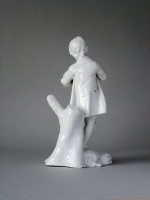 Auf einem Grassockel steht ein Knabe vor einem Baumstumpf. Mit der rechten Hand weist er auf ein Vogelnest mit jungen Vögeln, das sich in dem Hut befindet, den er auf seinem linken Unterarm hält. Der Knabe ist mit einem Hemd, Kniehosen und einem Gehrock bekleidet und trägt ein geknotetes Halstuch. Die Modellierung des Gesichts, die bewegte Körperhaltung und der weisende Finger sind Merkmale des Bildhauers und Modelleurmeisters Johann Peter Melchior (1747 - 1825). Vorbild für den Knaben ist der Kupferstich "Knabe mit Vogelnest" von Gottlieb Leberecht Crusius aus der Folge der "Cappriccij, première partie" (Leipzig 1766). Weitere Modelle dieser Figur haben sich erhalten im Historischen Museum der Stadt Frankfurt, im Bayerischen Nationalmuseum in München, im Museum für Angewandte Kunst in Köln, im Stadtmuseum in Alzey, im Victoria and Albert Museum in London und in der Sammlung Pauls im Historischen Museum Basel. - Aus der großen Anzahl der erhaltenen Porzellanfiguren dieses Knaben lässt sich schließen, dass diese Figur sehr beliebt war und gut verkauft wurde. Bezeichnung unter dem Boden: unterglasurblaue Radmarke, Ritzzeichen "H 1" "N 4"