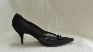 Ein Paar Schwarze Damen-Halbschuhe aus Stoff und Veloursleder. Die Schuhe haben eine Spitze Form und einen metallgenagelten mit Veloursleder bezogenen Absatz (5 cm). Zudem ist die Verse mit Veloursleder bezogene und es verläuft ein Stoffstück von der Schuhspitze bis zum Spann.
