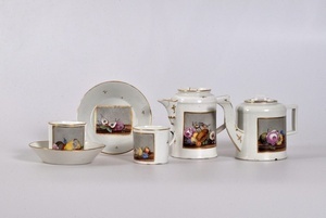 Kaffekanne, Teekanne und zwei Tassen mit Untertasse (mit Stillebendekor)