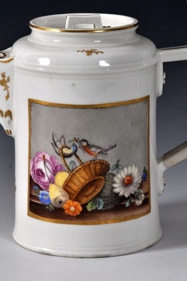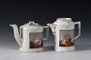 Kaffekanne, Teekanne und zwei Tassen mit Untertasse (mit Stillebendekor) Höchster Porzellanmanufaktur 1780-90