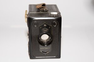 Bis zum 2. Weltkrieg produzierte Zeiss IKON AG (1926 in Dresden gegründet) hochwertige Kameras, Projektoren (Film), Buchungsmaschinen und Filme. Aus dieser Zeit stammt auch unsere Zeiss Ikon Tengor Box 54/2. Hergestellt in Dresden zwischen 1934 bis 1938. Die Box besitzt 2 Sucher, für Hoch bzw. Queraufnahmen. Das Auslösen erfolgt über einen kleinen Hebel oder über einen Drahtauslöser. Eine vorhandene Auslöseverriegelung verhindert eine unbeabsichtigte Belichtung. Die Auslösezeit ist fix auf 1/25s eingestellt. Drei Blendeneinstellungen sind möglich 11 / 18 / 25. Interessant ist die Entfernungseinstellung. Zwischen drei Einstellungen kann gewählt werden, 1,5 m 4 m und unendlich. Je nach Einstellung werden durch das betätigen des Auslösers, die entsprechenden Linsen vor das Objektiv geschoben. Das Objektiv ist ein Görz Fontar mit einer Blende 11 und einer Brennweite von 110mm. Als Film wird ein 120 er Rollfilm verwendet. Das Negativformat beträgt 60 x 90 mm