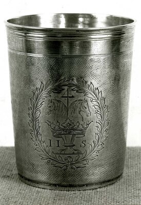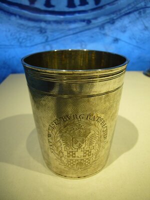 Konischer Silberbecher mit flachem Standring und flachem Boden. Auf der Vorderseite ist, umrahmt von einem ovalen Lorbeerkranz, das Stadtwappen von Weißenburg eingraviert und darüber das französische Königswappen mit drei Lilien und Königskrone darüber. Umschrift: STAT WEISENBVRG RATSBECHER 1693. Auf der Rückseite befindet sich in einem ovalen Lorbeerkranz ein Familienwappen mit einer Krone auf einem Balusterschaft und zwei aus der Krone wachsenden, voneinander abgewandten Pferdeköpfen. Darüber ein Hauszeichen in Form einer Vier, neben dem Baluster die Initialen I.I.S. Unter dem Boden Meistermarke bzw. Beschauzeichen. Der Becher veranschaulicht durch das französische Königswappen die Zugehörigkeit Weißenburgs zu Frankreich. Nach dem Westfälischen Frieden waren weite Teile des Elsass unter die Kontrolle Frankreichs gekommen. Die so genannte Dekapolis, ein Bund aus zehn freien Reichsstädten links des Rheins, war zwar zu dieser Zeit noch eigenständig, jedoch weitestgehend schutzlos. In den 1670er Jahren annektierte Ludwig XIV. diese zehn Städte, zu der auch Weißenburg gehörte. Ab 1680 gehörten das Elsass und der Zehnstädtebund dann auch formal zu Frankreich. Der Frieden von Rijswijk 1697 legte zwar fest, dass Frankreich seine Eroberungen außerhalb des Elsass und rechts des Rheins wieder abgeben musste, bestätigte dafür jedoch die Zugehörigkeit des Elsass und er Dekapolis zu Frankreich.