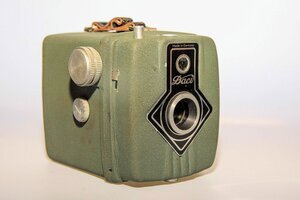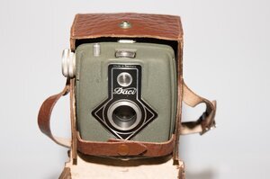 Bald nach dem 2. Weltkrieg gründetet Bernhard Dangelmaier ein Kamerawerk in Reutlingen. Seine Kameras wurden unter dem Namen Dacora vertrieben. 1972 wurde die Produktion eingestellt. Unsere Modell „Daci grün“ ist eine Boxkamera und wurde etwa 1955 produziert. An Ausstattungsmerkmalen gibt es nicht viel. Ein Sucher und lediglich zwei Auslösezeiten 1/40s. und B. mussten genügen. Dafür kostete das Modell im Fachhandel auch nur 20 DM. Das eingebaute Objektiv ist eine Meniskuslinse mit feststehenden Blende 9. Als Film wird ein 120 er Rollfilm verwendet Das Negativformat beträgt 60 x 60 mm. Die lederne Bereitschaftstasche ist noch vorhanden.