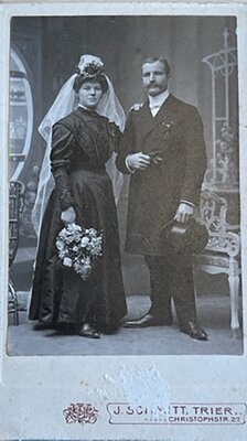 Ein Brautpaar in festlicher Kleidung. Die Braut, wie damals üblich, ganz in schwarz, hakt sich beim Bräutigam unter. Die trägt einen bodenlangen, weißen Schleier. In der linken Hand hält sie ein Gebetsbuch. Der Bräutigam trägt in der rechten Hand einen Zylinder. Ihre Blicke sind ernst und auf den Fotografen gerichtet. Das Foto ist auf eine Pappe mit dem Namen des Ateliers geklebt.
