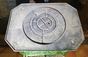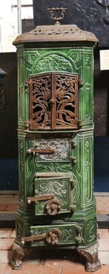 Grün emaillierter Kochofen mit floralem Dekor. Der Ofen steht auf 4 bronzefarbenen Füßen. Das darüberliegende erste Stockwerk enthält den Aschekasten, der über ein Türchen mit Regulierschraube zugänglich ist. Im zweiten Stockwerk darüber befindet sich eine Tür mit Regulierschraube zur Brennkammer und darüber eine Tür zum Füllen des Ofens mit Brenngut. Über dem eigentlichen Ofen befindet sich ein Stockwerk mit einer Kochplatte, die hinter einer zweiflügligen, reich mit durchbrochenem Rankenwerk verzierten Tür zu finden ist. Ganz oben befindet sich eine weitere Platte, die mit einem ornamental verzierten Deckel abgedeckt werden kann. Inschriften: Am zweiten Stockwerk des Ofens ganz oben: Eisthal Pege Ofen No 9 Auf der oberen Herdplatte: DRP 467367 (Gruppe) 23(DRP bedeutet Deutsches Reichs Patent) Das o.g. Patent wurde ab dem 1. Dezember 1925 - ausgegeben am 4. Oktober 1928 - zugunsten von Nicolaus Lehnert und August Paulus in Saarbrücken ausgestellt. Es bezieht sich auf die Ofenplatte, die von einem anderen Ofen stammt. Siehe beliegendes Foto Nr 8 (einfach ein Foto anklicken und dann mit dem Pfeil weiterklicken) Quelle: Deutsches Marken- und Patentamt; Patentschrift D.R.G.M. 467367
