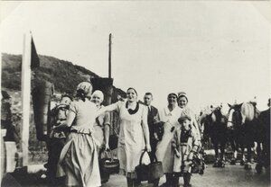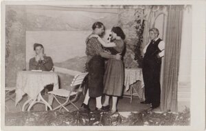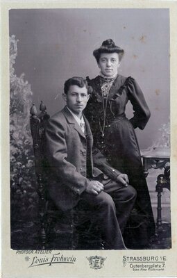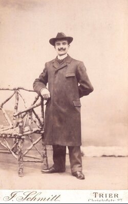 Zu sehen ist ein Mann, der eine weiße Schürze trägt. In der linken Hand befindet sich ein Wetzstahl, in der rechten ein Messer. Das Foto wurde im Freien, vor einer kleinen Mauer aufgenommen. Dem Mann liegt ein großer Hund zu Füßen, welcher aufmerksam schaut. Wahrscheinlich fand, wie früher üblich, eine Hausschlachtung statt. Das Foto wurde auf eine Pappe, die dem Atelier als Werbeträger diente, aufgeklebt.