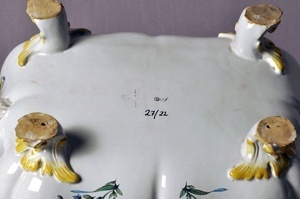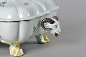Rechteckige, gebauchte Terrine auf vier Volutenfüßen mit zwei Widderköpfen als Griffe an den Schmalseiten; Auf dem Deckel ein liegender Widder als Griff. Zu der Terrine gehört eine ebenfalls rechteckige große Platte. Terrine und Platte sind mit Nelkenbuketts bemalt. Platte und Schüssel sind unter dem Boden mit schwarzgrauer Radmarke bezeichnet, Signatur "IZ" = Johann Zeschinger. Höhe der Terrine: 24,0 cm / Breite der zugehörigen Platte: 29,2 cm. Bezeichnung unter dem Boden: schwarzgraue Radmarke auf Strich, Signatur "IZ"