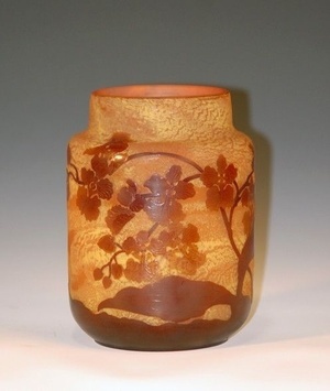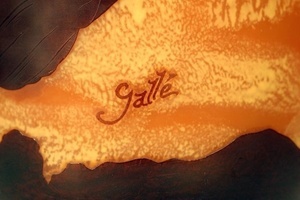 Grundglas mit flockigen karamelfarbenen Pulveraufschmelzungen, außen hell- und dunkelbraun überfangen, Dekor erhaben auf in zwei Arbeitsgängen geätztem Grund Bezeichnung auf der Wandung: Gallé