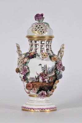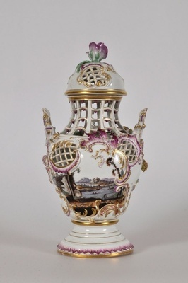 Als Prunkvasen dienten solche Potpourri-Vasen vorrangig der Repräsentation. Potpourri-Vasen sind in der Regel bauchige, vasenförmige Gefäße mit einem durchbrochenen Deckel. Die Gefäße waren häufig aufwendig verziert und zusätzlich oft reich und mehrfarbig bemalt. Diese Vase ist beidseitig farbig staffiert. Die von Kartuschen gerahmten Landschaften auf der Vorder- und Rückseite stammen von dem Höchster Porzellanmaler Melchior Schöllhammer; in der Landschaft mit Blick über den Flulßauf mit Schiffen auf eine Burg ist die Malerei links signiert "Schelh. pinx". Potpourri-Vasen wurden eine Duftmischung aus Pflanzenteilen (Blüten, Wurzeln, Kräuter, Schalen von Zitrusfrüchten und Gewürze) befüllt - teilweise unter Zusatz von ätherischen Ölen oder Pflanzenauszügen. Dies sollte der Verbesserung des Raumduftes dienten. Bei Verwendung frischer Blüten wurden diese mit Zusatz von Salz konserviert. Andere Pflanzenteile wurden in getrocknetem Zustand eingefüllt. Die Mischung bildete nach einiger Zeit eine duftende, jedoch unansehnliche Masse. Letztere Beobachtung wird wohl zu der Benennung "Potpourri" geführt haben (frz.: "pot" + "pourri" = "verdorbener Topf"). Bezeichnung unter dem Boden: goldene Radmarke, Signatur auf der Flußlandschaft "Schelh. pinx"
