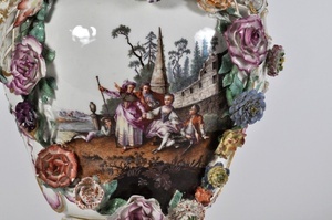 Als Prunkvasen dienten solche Potpourri-Vasen vorrangig der Repräsentation. Potpourri-Vasen sind in der Regel bauchige, vasenförmige Gefäße mit einem durchbrochenen Deckel. Die Gefäße waren häufig aufwendig verziert und zusätzlich oft reich und mehrfarbig bemalt. Diese Vase ist beidseitig farbig staffiert. Die von Kartuschen gerahmten Landschaften auf der Vorder- und Rückseite stammen von dem Höchster Porzellanmaler Melchior Schöllhammer; in der Landschaft mit Blick über den Flulßauf mit Schiffen auf eine Burg ist die Malerei links signiert "Schelh. pinx". Potpourri-Vasen wurden eine Duftmischung aus Pflanzenteilen (Blüten, Wurzeln, Kräuter, Schalen von Zitrusfrüchten und Gewürze) befüllt - teilweise unter Zusatz von ätherischen Ölen oder Pflanzenauszügen. Dies sollte der Verbesserung des Raumduftes dienten. Bei Verwendung frischer Blüten wurden diese mit Zusatz von Salz konserviert. Andere Pflanzenteile wurden in getrocknetem Zustand eingefüllt. Die Mischung bildete nach einiger Zeit eine duftende, jedoch unansehnliche Masse. Letztere Beobachtung wird wohl zu der Benennung "Potpourri" geführt haben (frz.: "pot" + "pourri" = "verdorbener Topf"). Bezeichnung unter dem Boden: goldene Radmarke, Signatur auf der Flußlandschaft "Schelh. pinx"