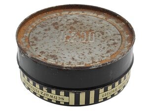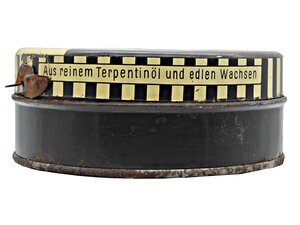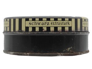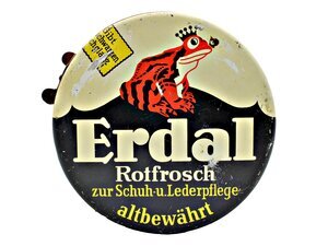 Blechdose Nr. 200 für Schuh- und Lederpflege der Marke "Erdal Rotfrosch" schwarz extrastark. Aufgrund des Aussehens des Frosches und des Drehverschlusses muss Werner & Mertz diese Dose zwischen 1919 und 1962 produziert haben.
