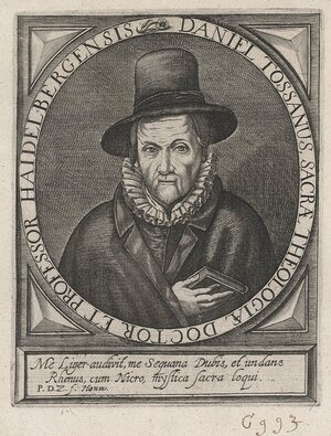 Der Kupferstich zeigt vor einem Fenster- oder Torbogen das Brustbild des reformierten Theologen Zacharias Ursinus (latinisierte Form des Namens Baer; 1534-1583). In seiner Heimatstadt Breslau wurde Ursinus bereits in jungen Jahren durch den Reformator Ambrosius Moibanus (1494-1554) beeinflusst. Während seines Studiums in Wittenberg schloss er sich Philipp Melanchthon (1497-1560) an. Auf Reisen nach Frankreich und in die Schweiz kam er in Kontakt zu den Reformatoren Heinrich Bullinger (1504-1575), Petrus Martyr Vermigli (1499-1562) und Johannes Calvin (1509-1564). Von Kurfürst Friedrich III. von der Pfalz, einem Anhänger der Reformierten, wurde er 1563 als Hofprediger nach Heidelberg berufen. 15 Jahre lang lehrte er an der dortigen Universität und war an der Verfassung des Heidelberger Katechismus beteiligt, der zum am weitesten verbreiteten Katechismus der reformierten Kirchen werden sollte. Unter dem lutherischen Sohn und Nachfolger Ludwig VI. wurde Ursinus entlassen, fand jedoch unter PfalzgrafJohann Casimir, einem Anhänger des reformierten Bekenntnisses, Anstellung im Collegium Casimirianum, einer nur fünf Jahre lang bestehenden reformierten Hochschule in Neustadt an der Haardt. [Johanna Kätzel]