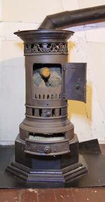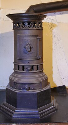 Regulierfüllofen in Form eines Kanonenofens von der Hütte in Trier-Quint. Der Ofen steht auf einem achteckigen Sockel. Unten befindet sich eine Schublade mit dem Aschekasten, darüber ein Schieberegler mit 3 Schlitzen zur Regulierung der Luftzufuhr. Über diesem ist eine große fast quadratische Tür zu finden. Sie besitzt in der Mitte einen ornamental gestalteten Griff und die Herkunftsbezeichnung "No 5" und "QUINT BEI TRIER" und dient zur Befüllung des Ofens sowie zum Zugang zur Brennkammer. Ganz oben befindet sich ein durchbrochener Rundfries mit auskragendem profiliertem Sims. Er hatte ursprünglich zusätzlich noch einen durchbrochenen Deckel. Öfen dieses Typs wurden gerne auch als Bahnhofsöfen verwendet. Hergestellt wurde der Ofen von der Eisenhütte in Quint (heute ein Stadtteil von Trier). Diese wurde 1683 gegründet und entwickelte sich im Laufe der Zeit zu einem bedeutenden Unternehmen. Sie betrieb von 1857 bis 1891 bei Schweich ein eigenes Eisenbergwerk. Nach mehrfachem Besitzerwechsel kommt das Unternehmen zum Klöckner-Konzern, der 1925 das Walzwerk stilllegt und zum 31.1.1972 diesen Unternehmensteil ganz aufgibt. Quint-Öfen wurden von Ende des 17. Jahrhunderts bis 1960 hergestellt. Heute (2021) sind nur noch das Schloss des Hüttenherrn und einige Verwaltungsgebäude erhalten.