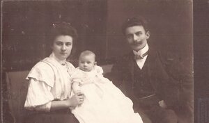 Zu sehen sind zwei Bilder, jedoch mit den gleichen Personen. Es handelt sich hierbei, allem Anschein nach, um die Eltern mit einem Sägling. Der Säugling trägt sein Taufkleid. Die Mutter trägt den Eheringnicht, wie auf die rheinische Art, links, sondern rechts. Auf dem ersten Foto sind die Eltern dem Kind liebevoll zugewandt, während bei der zweiten Aufnahme alle drei in die Kamera schauen. Diese Änderung der Blickrichtung gibt dem Foto sofort eine andere Stimmung. Das Foto wurde auf ein Stück Pappe geklebt, wobei an der rechten Seite der Name des Fotoateliers steht.
