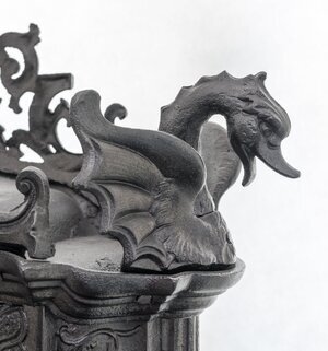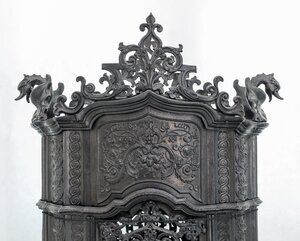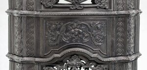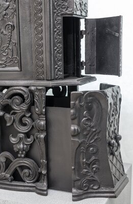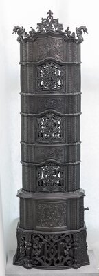 Gusseiserner Etagenofen um 1850, vermutlich aus der Gießerei Horowitz (Böhmen) im Stil der Neorenaissance. Im Zeitraum von 1858 bis 1868 wurde der Ofen nachweislich auch in der Carlshütte unter der Bezeichnung "Ovaler Ofen No. 87" gefertigt. Es handelt sich um einen feingliedrigen Zirkulierofen auf vierteiligem durchbrochenen Fußsockel mit integriertem Aschenkasten. Auf den Brennkammerseiten sind kartuschengefasste szenische Darstellungen der Allegorie der Liebe mit Ohrmuschelwerk eingerahmt zu erkennen. Die durchbrochenen Ziertüren zeichnen sich durch arabeskenartige Flechtswerksfüllungen aus.