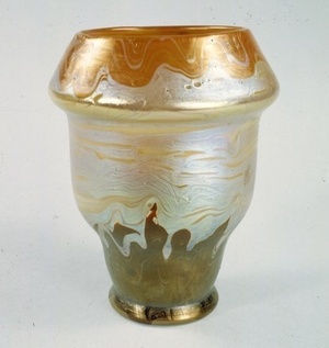 Farbloses Glas mit aufgelegtem dicken Glasfaden in Form einer Schlange, die sich um den bamartig gestalteten Gefäßkörper windet. Der Gefäßkörper hat eine gelb-bräunlich irisierende Metallbedampfung, die Schlange hingegen hat ein bläuliche Metallbedampfung. Bezeichnung: unbezeichnet