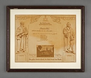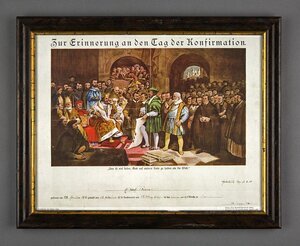 Konfirmationsschein (Grüne Konfirmation) für Paul Ziegle, Hochformat, gerahmt. Serieller Formularvordruck mit grafischer Gestaltung im neogotischen Stil mit diversen religiösen Szenen aus dem Leben Jesu Christi. Im Mittelfeld die handschriftlich eingetragenen individuellen Angaben: "Paul Ziegle, geb. den 14. November 1895, 4. April 1909 (Tag der Konfirmation) L. Sauter, Spesbach, Pfarrer".