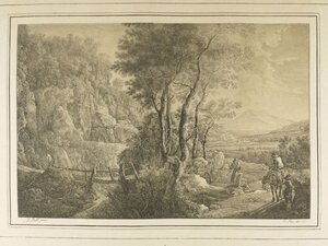 Lithografie von Caspar Auer nach einem Gemälde des niederländischen Malers Jan Wynants (auch Wijnants). Unten links steht"J. Wynants pinx:", unten rechts "C. Auer del: 1819". Darstellung einer teils dicht mit Bäumen bewachsenen Landschaft die nach hinten rechts den Blick auf offene Felder und Häuser freigibt. Rechts unten ist ein See. Ganz links dominieren zwei tote Bäume die Lithografie. Entlang des Sees führt ein breiter Feldweg. Auf diesem befinden sich ein Mann hoch zu Pferde, begleitet von einem Mann zu Fuß mit auf die linke Schulter gelegtem Stock und zwei Hunden. Sie gehen mit dem Rücken zum Betrachter hin. Über eine kleine Anhöhe hinweg kommt ihnen ein weiterer Mann entgegen. Dieser trägt eine schwer beladenen Kiepe auf dem Rücken und geht leicht nach vorne geneigt mit Wanderstock in der rechten Hand. Weiter hinten auf dem Feldweg, auf Höhe des Sees geht ein Hirte mit Stock und Hund. Es ist nicht eindeutig zu erkennen, ob die Herde aus Schafen oder Ziegen besteht. In den Feldweg sind wie von einem Wagen stammend, zwei parallele Furchen eingegraben. Zum Künstler: Caspar Auer (1795-1821), deutscher Maler und Lithograf aus München. Sein Vater war Schlosswärter in Amalienburg. Bis 1819 studierte er an der königlichen Akademie der Bildenden Künste in München. Im Anschluss daran arbeitete er als Lehrer an dem königlichen Erziehungsinstitut am Anger in München. Er starb bereits 1821. [Kathrin Koch]