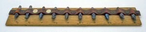 Auf einem Holzbrettchen ist ein schmales Lederriemchen so angebracht, dass 10 kleine Schlaufen entstehen. In diese Schlaufen sind insgesamt 9 Redisfeder und eine Ornamentfeder gesteckt. Zudem sind die Schriftstärken der Feder handschriftlich vor jeder Schlaufe angegeben. Die Federn sind Schnurzugfeder und sind auch unter der Bezeichnung Zierschriftfeder und Plattenfeder bekannt. Die Marke „Ornamentfeder“ der Firma Brause & Co ist noch in deren Angebot. Die „Redisfeder“ ist als Markenbezeichnung der Firma Heintze & Blanckertz bekannt. An der Spitze dieser Federn ist eine Platte angebracht, die die Schriftstärke vorgibt. Außerdem ist sie mit einer Überfeder (Ober- und Unterfeder) bedeckt und kann dadurch besonders viel Tinte aufnehmen. Es gibt die Federn in verschiedenen Strichstärken. Der rote Federhalter hat die Aufschrift UNIVERSAL und ist mit einer Ornamentfeder bestückt. Die Masse der Federn = 3,6-0,6 cm und des Federhalters = 17 cm Länge und 0,6 cm Durchmesser