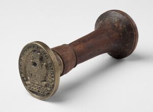 Amtliches Siegel der Bürgermeisterei ("Mairie") Knittelsheim (heute in Rheinland-Pfalz) mit ovaler Siegelplatte und gedrechseltem Holzgriff mit pilzförmigem Knauf. Das Stempelsiegel zeigt den napoleonischen Adler mit Krone und Blitzbündel. In der Folge der französischen Revolutionskriege und der Annektierung exterritorialer Gebiete durch die Franzosen, wurden die dort vorherrschenden Verwaltungsstrukturen zerschlagen. Die neue Gliederung erfolgte nach französischem Vorbild mit Mairie, Kanton, Arrondissement und Département. Eine Mairie war nicht nur das Bürgermeisteramt einer Gemeinde, sondern als unterste Verwaltungseinheit in der Regel für mehrere Gemeinden zuständig. Der Mairie Knittelsheim war z.B. noch die Gemeinde Ottersheim zugeordnet. Beiden Gemeinden gehörten zum Kanton Germersheim, der wiederum Teil des Arrondissements Speyer im Département Mont-Tonnerre war. [Johanna Kätzel]