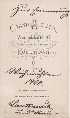 Zu sehen ist ein älteres Ehepaar. Die Frau mit, streng nach hinten, zusammengebundenen Haaren. Der Gatte im schwarzen Anzug mit Fliege und einem sehr grüßen Schnauzbart. Während des Fotografierens hatte der Fotograf eine Blende vor dem Objektiv. Dies führt das Auge des Betrachters noch mehr zum eigentlichen Porträt. Das Foto wurde in einen Passepartouts geklebt, unter dem der Name des Fotografen steht. Neben dem Namen des Ateliers, ist auf der Rückseite ebenfalls eine Widmung mit der Jahreszahl 1900 zu finden.