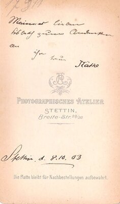 Zu sehen ist das Porträit von Käthe Jahn, einer jungen Frau. Die Haare sind nach hinten gebunden, und werden mit einer Schleife zusammengehalten. Bemerkenswert ist die Spitze, mit der das Oberteil des Kleides und der Kragen besetzt sind. Auf der Rückseite des Bildes ist , außer dem Namen des Ateliers, auch eine Widmung mit dem Tagesdatum 8.10.03 zu finden.
