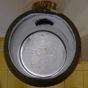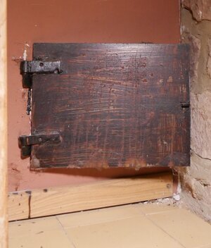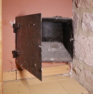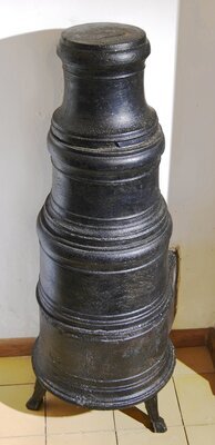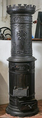 Rundofen (Pottofen, Kanonenofen) mit Langhals ohne Vorofen. Konstruiert als Hinterlader. Der Ofen besitzt eine ungeteilten Feuerraum (ohne Rost) und ist deshalb nur zur Verfeuerung von Holz geeignet. Der Ofen ist ein sogenannter Hinterlader und wird vom Nebenraum aus beheizt. Dort wird in einem sogenannten Vorofen ein Holzfeuer entzündet und der heisse Rauch zieht in den aus einem Raum bestehenden Rundofen und erwärmt diesen. Der Pottofen hat seinen Namen von dem Hüttenwerk Coolebrook-da bei Pottstown in Pennsylvania, das ab 1735 runde Stubenöfen fertigte. Leider besitzt der Ofen keinen Hinweis auf den Hersteller. Die Zuschreibung zur Hütte De Dietrich (Niederbronn) erfolgte auf Grund einer Abbildung eines nahezu identischen Ofens in Hammer/Michelsberger S. 92 (s.Literaturangabe unten).