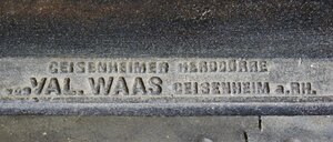 Dörrofen der Firma „Valentin Waas– Inhaber Gebr. Waas“ in Geisenheim zur Trocknung und Haltbarmachung von Obst. Unser Dörrofenaufsatz bestand unten aus 7 Holzrosten von denen 6 erhalten sind zur Aufnahme des zu trocknenden Obsts. Diese werden beim Trockenvorgang von der heißen Luft aus dem unter dem Aufsatz befindlichen Ofen durchströmt. Inschrift: GEISENHEIMER HERDDÖRRE ... VAL. WAAS GEISENHEIM a-RH Die Firma Valentin Waas war im gleichen Ort wie die damalige Landwirtschaftliche Lehr- und Versuchsanstalt (heute Gartenbauzentrum Geisenheim) gelegen. Der Erfolg des Unternehmens ist auch im Zusammenhang mit der Gründung der königlichen Lehr- und Forschungsanstalt für Wein-, Obst- und Gartenbau 1872 in Geisenheim zu sehen. Für deren ersten Direktor, Landesökonomierat Rudolf Goethe, Obstanbau und dessen Verwertung im Vordergrund stand. Ab 1884 beschäftigte sich dort eine eigene Abteilung mit der Dörre von Obst zur Haltbarmachung. Durch deren Zusammenarbeit mit der Firma Waas gingen zwei verschiedene Dörren in Produktion. Mit der Einführung neuer Konservierungsverfahren auf Basis von Kühlung und dem Einsatz von Elektroenergie gingen in den 50er Jahren die Anfrage immer mehr zurück und schließlich wurde 1964 die Produktion eingestellt.