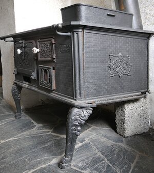 Tafelherd. Der Herd stand ursprünglich auf vier verzierten Füßen, von denen die beiden vorderen erhalten sind. Im Museum wird der Herd hinten von Beton-Steinen abgestützt. In die Frontseite ist links das Ofenrohr eingelassen. Darunter ist ein rechteckiges Loch für eine heute nicht mehr vorhandene Schublade. Rechts oben führt ein Türchen zur Brennkammer. Daruter verdeckt eine Abdeckung mit einem nicht mehr vorhandenem Schieberegulierer den Aschekasten. Letzter stammt aufgrund des sehr unterschiedlichen Dekors genauso wie die Füße wahrscheinlich von einem anderen Hersteller. Sie wurde entweder schon bei der Produktion dazugekauft order erst später als Ergänzung verwendet. Ganz rechts oben befindet sich die Angabe des Herstellers: GEBR.ROEDER DARMSTADT. Die Herdplatte wird vorne von einem Geländer geschützt. Die gusseiserne Herdplatte enthält zwei mit Ofenringen verschließbare runde Löcher und ein viereckiges Loch für das Wasserschiff.Die linke und die rechte Seitenwand sind mit Zigelsteindekor und in der Mitte mit einem Ornament verziert. Die Herdfabrik Gebrüder Roeder wurde 1866 von Philipp Roeder gegründet und ab zusammen mit seinem Bruder Louis geführt. Innerhalb der ersten 10 Jahre wurden 100.000 Herde produziert. In den Weltkriegen produzierte die Firma vor allem Kochherde und Kessel für das Militär. Nach dem Zweiten Weltkrieg wurden Kohle-, Gas- und Elektroherde produziert, ebenso Großkochanlagen, Heizgeräte und Spülmaschinen. 1966 kam das Unternehmen in wirtschaftliche Schwierigkeiten und wurde stillgelegt. Die Großküchentechnik ging in der Buderus-Gruppe auf.