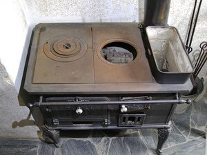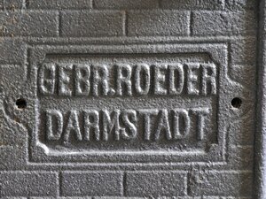 Tafelherd. Der Herd stand ursprünglich auf vier verzierten Füßen, von denen die beiden vorderen erhalten sind. Im Museum wird der Herd hinten von Beton-Steinen abgestützt. In die Frontseite ist links das Ofenrohr eingelassen. Darunter ist ein rechteckiges Loch für eine heute nicht mehr vorhandene Schublade. Rechts oben führt ein Türchen zur Brennkammer. Daruter verdeckt eine Abdeckung mit einem nicht mehr vorhandenem Schieberegulierer den Aschekasten. Letzter stammt aufgrund des sehr unterschiedlichen Dekors genauso wie die Füße wahrscheinlich von einem anderen Hersteller. Sie wurde entweder schon bei der Produktion dazugekauft order erst später als Ergänzung verwendet. Ganz rechts oben befindet sich die Angabe des Herstellers: GEBR.ROEDER DARMSTADT. Die Herdplatte wird vorne von einem Geländer geschützt. Die gusseiserne Herdplatte enthält zwei mit Ofenringen verschließbare runde Löcher und ein viereckiges Loch für das Wasserschiff.Die linke und die rechte Seitenwand sind mit Zigelsteindekor und in der Mitte mit einem Ornament verziert. Die Herdfabrik Gebrüder Roeder wurde 1866 von Philipp Roeder gegründet und ab zusammen mit seinem Bruder Louis geführt. Innerhalb der ersten 10 Jahre wurden 100.000 Herde produziert. In den Weltkriegen produzierte die Firma vor allem Kochherde und Kessel für das Militär. Nach dem Zweiten Weltkrieg wurden Kohle-, Gas- und Elektroherde produziert, ebenso Großkochanlagen, Heizgeräte und Spülmaschinen. 1966 kam das Unternehmen in wirtschaftliche Schwierigkeiten und wurde stillgelegt. Die Großküchentechnik ging in der Buderus-Gruppe auf.