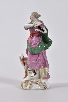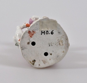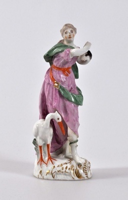 Stehende Frauenfigur mit erhobenen Armen. Auf der linken Hand sitzt ein Hummer, der mit seiner Schere in die Hand kneift, die freie rechte Hand nähert sich abwehrend. Um das vorgesetzte linke Bein windet sich eine Schlange, die vermutlich zubeißt (Oberteil ist abgebrochen) und ein Storch zielt mit seinem langen spitzen Schnabel verdächtig auf den nackten ungeschützten Fuß. Diese Figur wurde in Höchst nach dem Vorbild des Meißener Modellmeister Friedrich Elias Meyer gefertigt, sie gehört zur allegorischen Gruppe, welche die "5 Sinne" darstellt: Sehen: die visuelle Wahrnehmung mit den Augen. Der Sehsinn wird meist als Person dargestellt, die in einen Spiegel sieht oder eine Schrift liest. Hören: die auditive Wahrnehmung mit den Ohren, dargestellt als musizierende Person. Riechen: die olfaktorische Wahrnehmung mit der Nase, dargestellt als Person, die sich eine Blüte (oder ähnliches) zum Riechen an die Nase hält. Schmecken: die gustatorische Wahrnehmung mit der Zunge, dargestellt als Person, die Früchte in der Hand hält. Auch essende oder trinkende Figuren sind bekannt. Fühlen: Tasten, die taktile Wahrnehmung mit der Haut, dargestellt als Person, die Schmerz an der Haut erfährt. Hier zwickt ein Krebs mit seiner Schere in die Hand und der Storch ist im Begriff, mit seinem spitzen Schnabel in den zarten Fuß zu pieksen. Bezeichnung unter dem Boden: eisenrote Radmarke unter Strich; Signatur "P:G:S"; Ritzzeichen "IG 68"