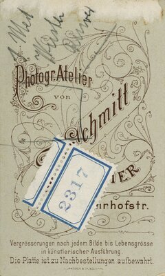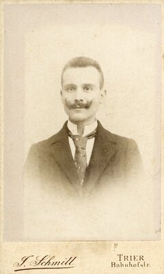 Frontalportrait eines jungen Herren mit Kurzhaarschnitt und nach oben gezwirbelten, struppigen Oberlippenbart. Er schaut links ganz knapp am Betrachter vorbei. Er trägt ein dunkles Sakko mit weißem Hemd und eine locker gebundene leicht gemusterte Krawatte. Auf der Rückseite: Photogr. Atelier J. Schmitt Trier Bahnhofstr. umrankt von zierlichen Arabesken. In der Mitte eine schräg eingeklebte, umrandete Marke: 2317