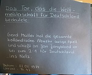 Zu sehen ist ein Fotoalbum, welches aus achtzehn Seiten stärkerer Pappe besteht, welche von einer Kordel zusammengahalten werden. Auf die Seiten wurden die Bilder und Zeitungsausschnitte geklebt. Alleiniger Inhalt des Albums ist die Fußball Weltmeisterschaft 1974, welche in Bild, Druckschrift sowie Zeitungsartikeln dokumentiert. wurde.