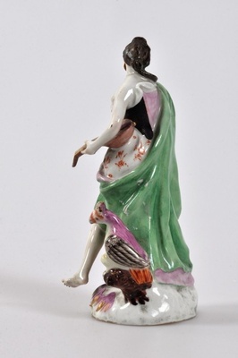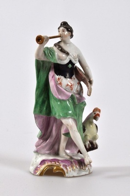 Stehende Frauenfigur, die mit ihrer rechten Hand ein Blasinstrument an den Lippen hält und eine Laute mit der linken Hand trägt. Neben ihr steht ein Hahn auf dem Boden. Diese Figur wurde in Höchst nach dem Vorbild des Meißener Modellmeister Friedrich Elias Meyer gefertigt, sie gehört zur allegorischen Gruppe, welche die "5 Sinne" darstellt: Sehen: die visuelle Wahrnehmung mit den Augen. Der Sehsinn wird meist als Person dargestellt, die in einen Spiegel sieht oder eine Schrift liest. Hören: die auditive Wahrnehmung mit den Ohren, dargestellt als musizierende Person. Riechen: die olfaktorische Wahrnehmung mit der Nase, dargestellt als Person, die sich eine Blüte (oder ähnliches) zum Riechen an die Nase hält. Schmecken: die gustatorische Wahrnehmung mit der Zunge, dargestellt als Person, die Früchte in der Hand hält. Auch essende oder trinkende Figuren sind bekannt. Fühlen: Tasten, die taktile Wahrnehmung mit der Haut, dargestellt als Person, die Schmerz an der Haut erfährt. Bezeichnung unter dem Boden: eisenrote Radmarke mit "C"