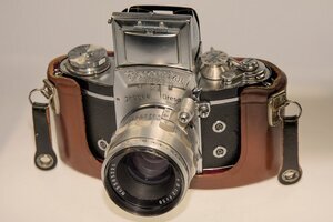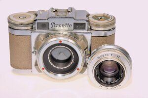 Unsere Sucherkamera ist eine Braun Paxette II. Sie wurde in Nürnberg produziert in den Jahren 1953 bis 1964. Diese Sucherkamera verfügt über ein Wechselobjektiv sowie einen Entfernungsmesser. Für die Belichtung stehen Zeiten von B bis 1 / 300s zur Verfügung. Auf dem Rückstellrad ist eine Merkhilfe für den eingelegten Film vorhanden. Die Paxette gab es in zwei Belederungen: schwarz und wie unser in grau. Das eingebaute Wechselobjektiv ist ein Steinheil Cassarit f 2,8/45 mm es wurde in München hergestellt. Als Film wird ein 135 er Kleinbildfilm verwendet, das Negativformat beträgt 24 x 36mm. Der Filmtransporthebel muss 2x bis zum Anschlag bewegt werden bevor ausgelöst werden kann. Das Wechselobjektiv hat ein Gewinde. Diese Sucherkamera wurde auch die Leica des kleinen Mannes genannt! Als Zubehör ist vorhanden eine Ledertasche für den Fotoapparat und eine Ledertasche für die Filter.
