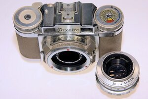 Unsere Sucherkamera ist eine Braun Paxette II. Sie wurde in Nürnberg produziert in den Jahren 1953 bis 1964. Diese Sucherkamera verfügt über ein Wechselobjektiv sowie einen Entfernungsmesser. Für die Belichtung stehen Zeiten von B bis 1 / 300s zur Verfügung. Auf dem Rückstellrad ist eine Merkhilfe für den eingelegten Film vorhanden. Die Paxette gab es in zwei Belederungen: schwarz und wie unser in grau. Das eingebaute Wechselobjektiv ist ein Steinheil Cassarit f 2,8/45 mm es wurde in München hergestellt. Als Film wird ein 135 er Kleinbildfilm verwendet, das Negativformat beträgt 24 x 36mm. Der Filmtransporthebel muss 2x bis zum Anschlag bewegt werden bevor ausgelöst werden kann. Das Wechselobjektiv hat ein Gewinde. Diese Sucherkamera wurde auch die Leica des kleinen Mannes genannt! Als Zubehör ist vorhanden eine Ledertasche für den Fotoapparat und eine Ledertasche für die Filter.