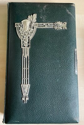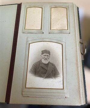 Zu sehen ist ein großes, in Leder gebundenes Album. Auf der Vorderseite befindet sich ein Zierbeschlag, der fast die gesamte Höhe der linken Seite einnimmt. Auf der rechten Seite befindet sich eine, nicht mehr funktionsfähige, Schließe. Im Inneren des Albums befinden sich zehn Seiten aus starker Pappe mit eingeschnittenen Passepartouts, zum einfügen der Fotos.