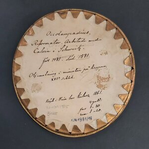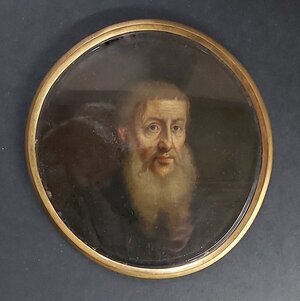 Miniaturporträt des Reformators Johannes Heussgen (auch geschrieben: Husschyn, Hussgen, Huszgen oder Hausschein, latinisiert und am häufigsten verwendet: Oekolampad bzw. Oekolampadius). Der Theologe wurde 1482 in Weinsberg geboren und starb 1531 in Basel. Er ist als Theologe, Humanist und als Reformator von Basel hervorgetreten. Darstellung mit langem, grauen Backenbart und kurzgeschorenem Haupthaar. Feingemaltes, von Falten zerfurchtes Gesicht vor einheitlich braunem Grund. Auf der Rückseite Beschriftung in schwedischer Sprache, die besagt, dass der Reformator Oecolampadius mit Calvin in der Schweiz arbeitete und dass dieses Miniaturporträt in Wien 1861 bei Kubarz gekauft wurde. Für die Pfalz von besonderem Interesse ist, dass Oekolampadius 1522 für einige Monate, während einer kurzzeitigen Verbannung aus Basel, Burgkaplan auf der Ebernburg des Franz von Sickingen war. Es existiert eine ganze Reihe nahezu identischer Miniaturbildnisse des Reformators und Pendantbildnisse seiner Frau Wibrandis Rosenblatt (sowie Bildnisse der gemeinsamen Tochter Aletheia und mutmaßlich deren Ehemannes). Sie datieren wahrscheinlich in die zweite Hälfte des 16. Jh., wurden möglicherweise von Wibrandis Rosenblatt selbst in Auftrag gegeben und dienten wohl dem Gedächtnis innerhalb der Familie. Es ist nicht auszuschließen, dass sie alle auf ein Original des zeitweise in Basel tätigen Hans Holbein d. J. oder dessen Umkreis zurückgehen. [Ludger Tekampe / Johanna Kätzel] Depositum der Evangelischen Kirche der Pfalz.