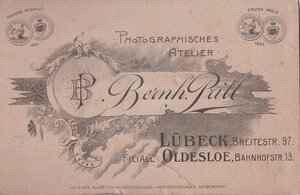 Zu sehen sind drei Kinder, zwei Mädchen und ein Junge, im Fotoatelier. Dort posieren sie stolz im Matrosenanzug beziehungsweise im Matrosenkleid. Die Mädchen tragen große Schleifen im Haar. Die wilhelminische Flottenpolitik führte zu einer symbolischen Wandlung des Matrosenanzugs. mit dem Kleidungsstück wurde die Begeisterung für die Flotte ausgedrückt. Der "echte Kieler Matrosenanzug" wurde zum Symbol des bürgerlichen Nationalstolzes. Kinder trugen den Anzug oft, und demonstrierten damit den Patriotismus ihrer Eltern. Eines der Mädchen hält eine aufgeschlagene Zeitschrift auf dem Schoss, was vielleicht ein Hinweis auf ein privates Ereignis sein könnte. Unter dem Foto, und auch auf der Rückseite befindet sich Werbung des Ateliers.