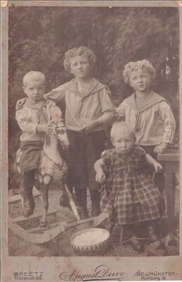 Zu sehen sind vier Kinder, drei Jungen und ein Mädchen. Die Kinder befinden sich wohl auf der Freifläche eines Ateliers, denn der Boden besteht aus Sand und Steinen. Eines der Kinder sitzt auf einem Schaukelpferd, zu dessen Hufen eine Trommel liegt. Die Jungen tragen einen Matrosenanzug. Die wilhelminische Flottenpolitik führte zu eines symbolischen Wandlung des Matrosenanzugs. Mit dem Kleidungsstück wurde die Begeisterung für die Flotte ausgedrückt. Der echte "Kieler Matrosenanzug" wurde zum Symbol des bürgerlichen Nationalstolzes. Kinder trugen den Anzug zu jeder Gelegenheit, und demonstrierten damit den Patriotismus ihrer Eltern. Unter dem Foto, und auf der Rückseite, befindet sich Werbung des Fotoateliers.