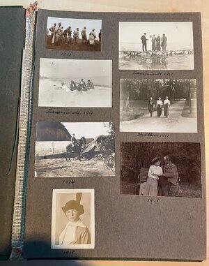 Ein privates Fotoalbum im DIA A 4 Format. Der grüne Einband ist aus starker Pappe, während die fünf Innenseiten aus dünnerem Karton bestehen. Die Aufnahmen sind durchgehend mit Datum versehen, teils auch mit Personennamen und Ortsangaben beschriftet. Die Augnahmen sind zwischen 1913 und 1916 enstanden. Die Fotos sind alle mit den Seiten fest verklebt. Von Elfriede Wilhelm gibt es noch ein zweites Fotalbum. Sie Link.