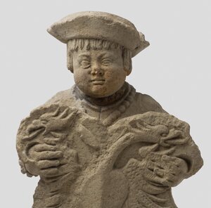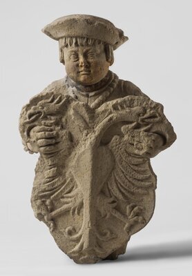 Unterlebensgroße Figur, Sandstein, 1. Hälfte 16. Jahrhundert. Die stehende Figur in zeittypischer Tracht trägt einen Wappenschild mit dem Reichsadler (Doppeladler der Habsburger).