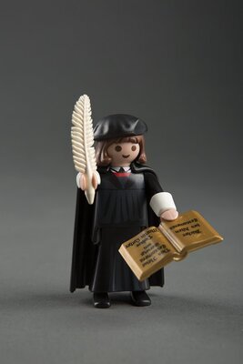 Playmobil-Figur in der Gestalt Martin Luthers. Stehende Figur mit schwarzem Umhang, weißen Manschetten, schwarzer Kopfbedeckung, weißer Schreibfeder und goldfarbener Bibel. Bibel innen mit dem Text bedruckt: "Bücher des alten Testaments - Das Neue Testament übersetzt von Dr. Martin Luther". Mit kleinem Papierprospekt, der in Wort und Bild über Luthers Wirkungs- und Lebensstationen informiert, herausgegeben von der Congress- und Tourismuszentrale Nürnberg. Quaderförmige Verpackung aus Karton, diese rundum bedruckt mit Produktinformationen (in Wort und Bild). Playmobil Artikel-Nummer: 9325. Sammlung von 9 identischen Exemplaren. Produziert anlässlich des 500-jährigen Jubiläums der Reformation 2017, angeblich in limitierter Auflage und angeblich das erfolgreichste Produkt der Firma Playmobil (goebra Brandstetter Stiftung & Co. KG Zirndorf). Martin Luther gehört zu den meistdargestellten Personen der Weltgeschichte. Bis heute begegnen uns Lutherdarstellungen im öffentlichen, kirchlichen und häuslichen Raum. Jede Epoche hat sich "ihr" Lutherbild geschaffen, den Reformator entweder verherrlicht oder für politische Zwecke instrumentalisiert. Während der Protestantismus bis ins 18. Jahrhundert Luther als "Kirchenvater", theologische Instanz oder auch aufgeklärten Geist verherrlicht, wird er im 19. und 20. Jahrhundert in Deutschland als Nationalheld vereinnahmt. Die im 20. Jahrhundert einsetzende Kommerzialisierung und Trivialisierung erreicht anlässlich des 500-jährigen Jubiläums der Reformation 2017 einen Höhepunkt: Luther-Souvenirs und Luther-Geschenkartikel scheinen auf Festveranstaltungen, in Museumsshops, Ladengeschäften und im Onlinehandel allgegenwärtig. [Wolfgang Knapp]