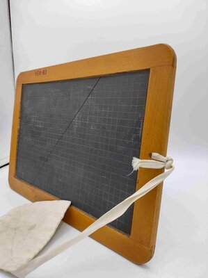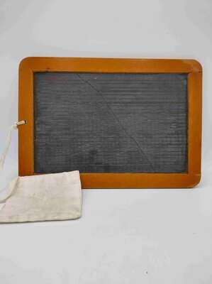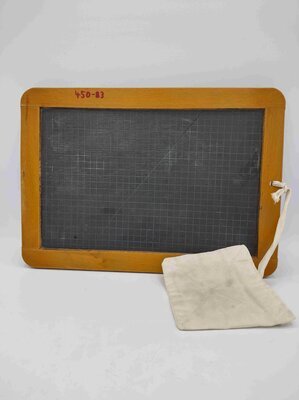 Die Schiefertafel besteht aus einer Schieferplatte, die von einem Holzrahmen eingefasst ist. Sie wurde bereits vor einigen Jahren inventarisiert und die Inventarisierungsnummer steht auf beiden Seiten auf der Tafel. In die Schiefertafel ist auf der einen Seite ein kariertes Muster und auf der anderen Seite Linien eingeritzt, so dass auf der einen Seite die Matheaufgaben und auf der anderen Seite die übrigen Aufgaben in der Schule bearbeitet werden konnten. Der Lappen zum Abwischen der Tafel ist am Holzrahmen befestigt, in welchem zu eben diesem Zweck ein Loch gebohrt ist. Durch die Tafel zieht sich auf Vorder- und Rückseite ein Riss, der Holzrahmen ist geleimt.