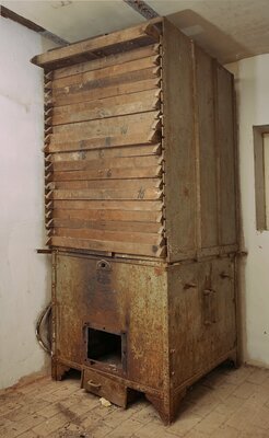 Dörrofen der Firma „Valentin Waas– Inhaber Gebr. Waas“ in Geisenheim zur Trocknung und Haltbarmachung von Obst. Der viereckige Dörrofen besteht unten aus einer Brennkammer aus Eisenblech mit einer nicht mehr vorhandenen Tür. Unter dieser hängt die Ascheschublade. Ziemlich weit oben an der Frontseite befindet sich die Herstellerplakette: VAL WAAS G.M.B.H. Maschinenfabrik GEISENHEIM A. RH. Über dem eigentlichen Ofen befinden sich 20 Holzroste zur Aufnahme des zu trocknenden Obsts. Diese werden beim Trockenvorgang von der heißen Luft aus dem Ofen durchströmt. Der Dörrofen ist stark renovierungsbedürftig und ist nicht öffentlich zugänglich. Die Firma Valentin Waas war im gleichen Ort wie die damalige Landwirtschaftliche Lehr- und Versuchsanstalt (heute Gartenbauzentrum Geisenheim) gelegen. Der Erfolg des Unternehmens ist auch im Zusammenhang mit der Gründung der königlichen Lehr- und Forschungsanstalt für Wein-, Obst- und Gartenbau 1872 in Geisenheim zu sehen. Für deren ersten Direktor, Landesökonomierat Rudolf Goethe, Obstanbau und dessen Verwertung im Vordergrund stand. Ab 1884 beschäftigte sich dort eine eigene Abteilung mit der Dörre von Obst zur Haltbarmachung. Durch deren Zusammenarbeit mit der Firma Waas gingen zwei verschiedene Dörren in Produktion. Mit der Einführung neuer Konservierungsverfahren auf Basis von Kühlung und dem Einsatz von Elektroenergie gingen in den 50er Jahren die Anfrage immer mehr zurück und schließlich wurde 1964 die Produktion eingestellt.