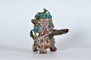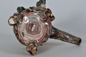 Die Kanne in Form eines knorrigen Eichenastes ist reich mit Applikationen verziert, es sind Zweige, Eichenblätter, Eicheln und Raupen aufgesetzt. Die Gefäßform mit abstehenden Handgriff im rechten Winkel zum Ausgießer ist spezifisch für Schokoladenkannen, diese Kostruktion erlaubte, das heiße Getränk mit einer Drehbewegung des Griffes auszugießen. Ungewöhnlich bleibt die reiche Gestaltung durch Naturelemente, die weder in der Keramik noch in der Metallkunst Europas Vorbilder hat. Diese Kanne, wie auch ihre Vergleichsstücke, zeigen keine Gebrauchsspuren. Deshalb bleibt es offen, ob diese Kannen nur zu dekorativen Zwecken oder auch zur praktischen Verwendung bestimmt waren. Wahrscheinlich standen solche Kannen als Schauobjekte auf Tafeln oder Kredenzen bei Jagdgesellschaften oder in Ermitagen. Bezeichnung unter dem Boden: I. Zeheiner in weißer Aussparung
