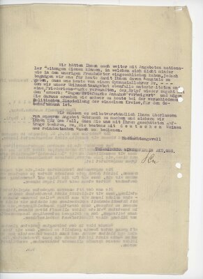 Der Zweite von drei Briefen - Der Trierische Winzerverein antwortet 1 Woche nach Erhalt des Briefes von Dr. Petzold und erklärt, dass die Damen auf Continental Büroschreibmaschinen die Briefe schreiben und diese "deutsche Normalmaschine mit Lateintypen ausgerüstet ist" Der Winzerverein bietet an, zukünftig "auf die Verwendung nur deutscher Wörter mehr Wert zu legen" Danach aber wird er deutlich und wehrt sich gegen die abgeleitete Unterstellung nicht "kerndeutsch zu denken." Der Brief endet mit ".....Sie bestens mit d e u t s c h e n Weinen aus rein deutschen Gauen zu bedienen"