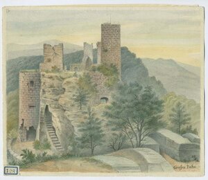 Grafik aus dem Zyklus "Pfälzer Landschaften und Sehenswürdigkeiten" des deutschen Landschaftsmalers Fritz Bamberger. Abgebildet ist der südliche Burgbereich der Burgruine Lindelbronn (auch Lindelbrunn). Unten links steht geschrieben "Lindelbronn. Parthie im Burghof." und das Datum 16/10/64. Oben links in Bleistift die Nr. 24 und unten rechts ist eine Marke mit der Nr. 127. Zu sehen sind die Reste der Burgmauern und eines Burggebäudes im südlichen Teil der Anlage. Ein Fenster ermöglicht den Blick ins Innere. Links im Hintergrund ist die Gebirgslandschaft des Wasgaus zu sehen, rechts hinten sind mehrere Nadelbäume. Im Vordergrund öffnet sich ein breites Loch im Felsen. Das Aquarell ist in gedeckten Braun-, Grün- und Grautönen gehalten. Die Burg liegt auf dem Gipfel eines bewaldeten Berges. Erstmals urkundlich erwähnt wird die Burg im 13. Jahrhundert mit der Nennung des Reichsministerialen Dieter von Lindelbrunn. Anfang des 14. Jahrhunderts fiel die Burg an die Grafen von Leiningen. Ab Mitte des 14. Jahrhunderts waren auch die Grafen von Zweibrücken-Bitsch Ganerben der Burg. Der Kreis der Gemeiner wurde im Verlauf der Jahrzehnte immer größer, da Anteile an der Burg gerne als Pfand verwendet wurden. Zerstört und niedergebrannt wurde die Burg 1525 im Bauernkrieg durch den Kleeburger Kolbenhaufe. Ein Wiederaufbau wurde nicht veranlasst. Die Gipfelburg befindet sich im Pfälzerwald auf dem Schloßberg, in der Nähe von Vorderweidenthal In Rheinland-Pfalz. [Kathrin Koch]