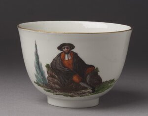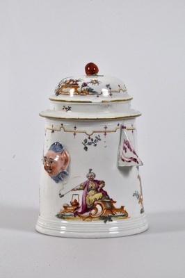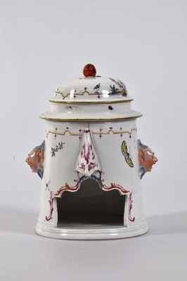 Die im 18. Jahrhundert beliebten kleinen und handlichen Rechauds waren Multifunktionsgeräte: sie waren Speisewarmhalter und Nachtlicht zugleich. Der Bouillonnapf war für Brühe, Suppe oder Brei geeignet. Der konische Untersatz hat einen profilierten Fuß und Lippenrand. Über dem Fußrand befindet sich eine querrechteckige, oben geschweifte Öffnung für das Öllämpchen (das leider verloren ist). Zwei applizierte farbige Faunsmasken dienen als Griffe und zwei spitz zulaufende reliefierte Windnasen befinden sich über den seitlichen Luftlöchern. Die Windnasen sind manganrot dekoriert. Die Gefäßwandung ist vorn und hinten je mit einem teetrinkenden Herren in chinesischer Tracht bemalt, Der Herr auf der Vorderseite raucht dazu eine lange Tonpfeife. Auf dem konischen Unterteil ist der halbkugelige Bouillonnapf mit Standring und hohem Rand aufgelegt. Der Rand ist außen mit bunten Streublumen bemalt. Der Deckel ist wie der Napf halbrund gewölbt und mit einem umlaufenden Bodenstreifen bemalt, auf dem Grashalme, Blumen und ein Gartentisch mit dekoriertem Obst stehen. Der aufgesetzte, rot bemalte Apfel dient als Deckelknauf. Das Motiv der in chinesischer Tracht gekleideten Herren geht auf den Kupferstecher Johann Esaias Nielson zurück. Sein Kupferstich ´Caffee, The und Tobac Zierathen´, (um 1750) diente dem Porzellanmaler als Vorbild.